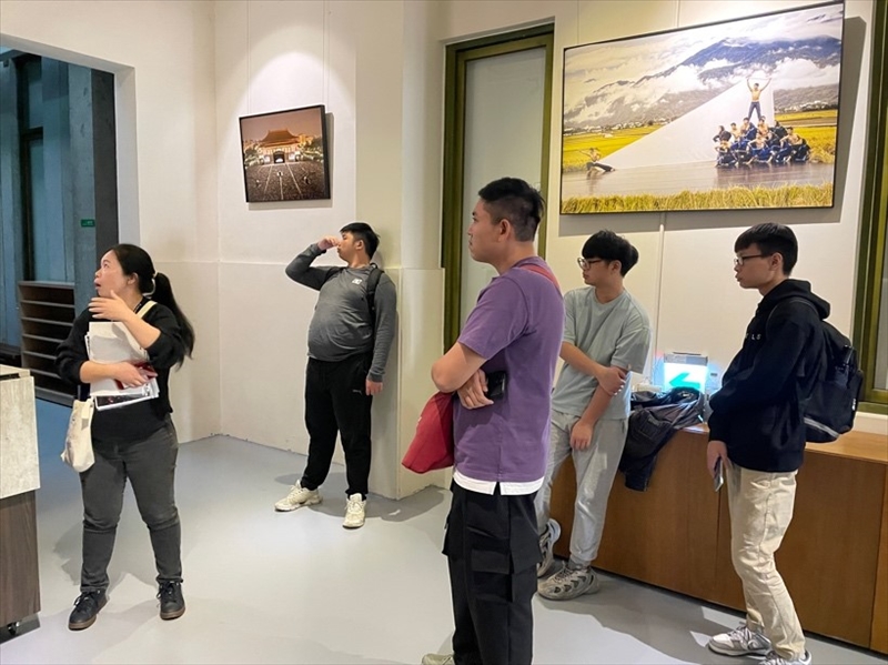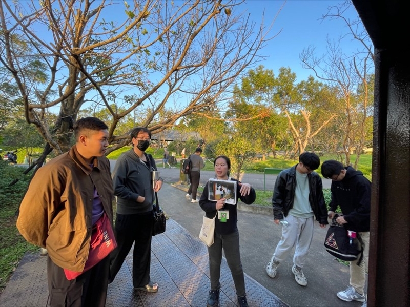 雲門劇場導覽人員透過歷史照片演繹創辦人林懷民先生對室外場域樹木的理念與堅持