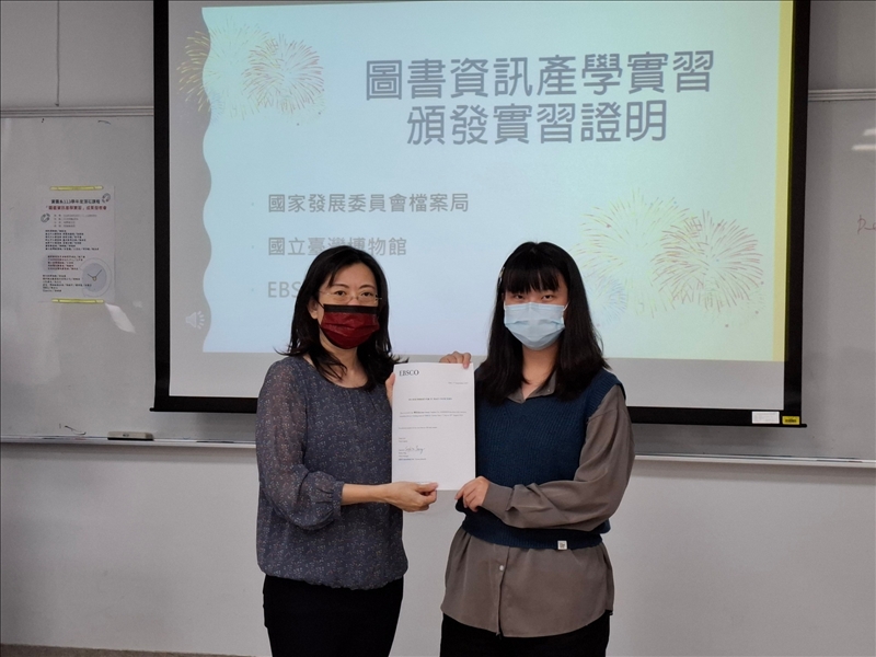 林雯瑤系主任代表EBSCO頒發實習證明給 陳玄沁同學