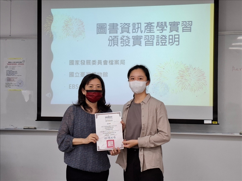 林雯瑤系主任代表國家發展委員會檔案 管理局頒發實習證明給趙子睿同學
