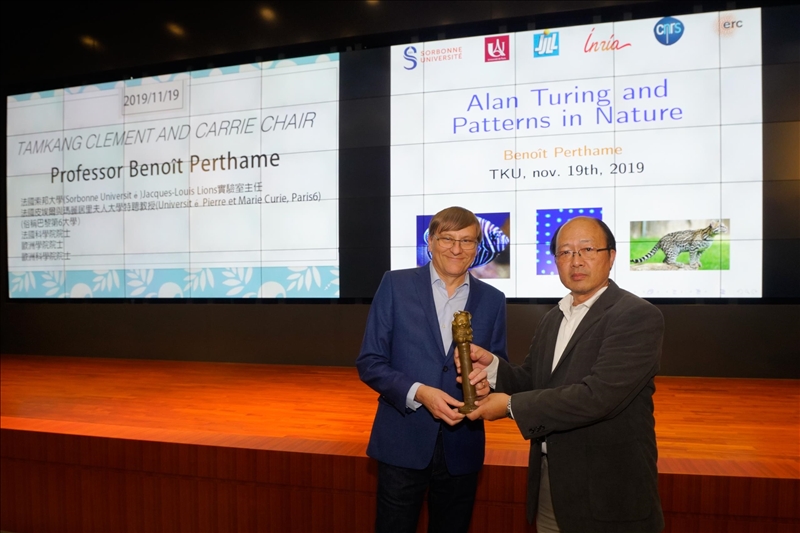 理學院施增廉院長(右)贈送Dr. Benoit Pertame (左)代表「熊貓講座」榮譽的銅雕獎座(馮文星攝影)