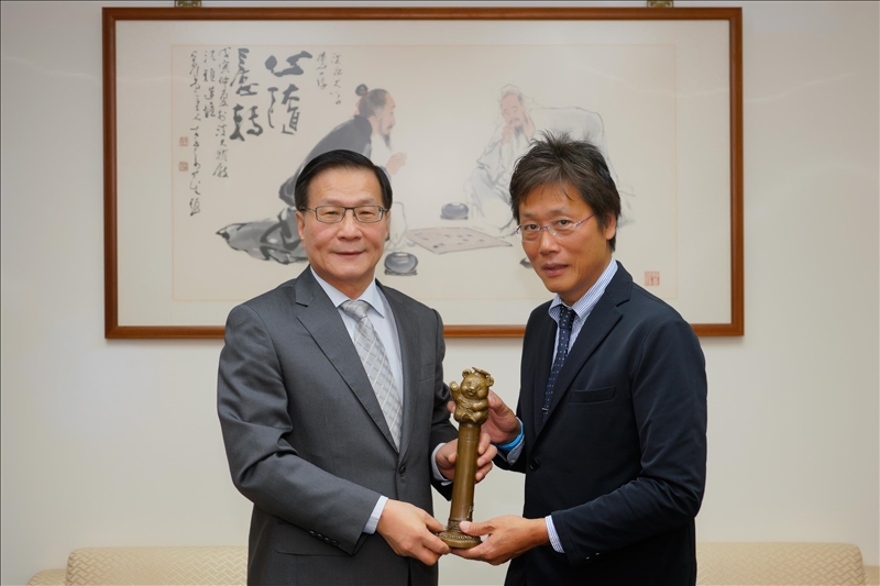 1-108年11月6日上午安達千波矢教授(右)拜會本校葛煥昭校長(左),校長致贈代表「熊貓講座」榮譽的銅雕獎座。(馮文星攝影)