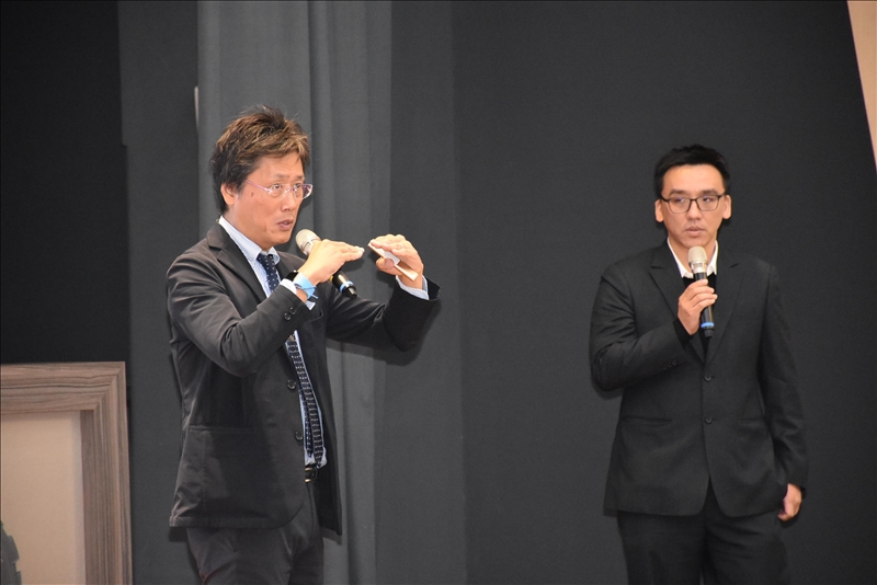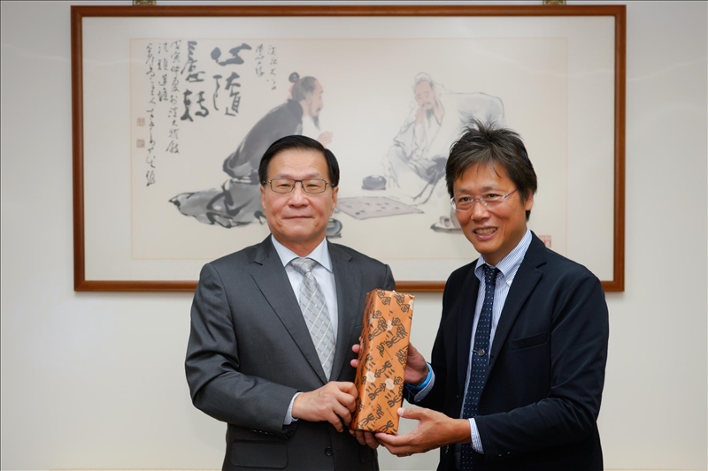 2-安達千波矢教授(右)贈送葛煥昭校長(左)禮品。(馮文星攝影)