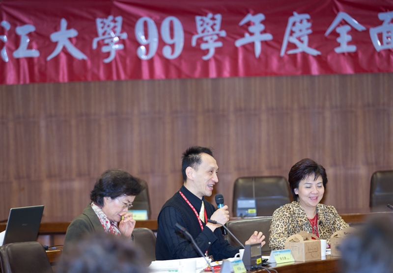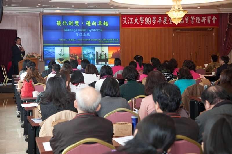 「99學年度全面品質管理研習會」於本週五(25日)在淡水校園驚聲國際會議廳、覺生國際會議廳、台北校園D501教室及蘭陽校園同步視訊進行主題為「提升自主管理意識,確保品質系統運作」。研習會分上下午兩梯次進行,參與人員包括校長張家宜、3位副校長、全校一、二級單位正副主管、秘書及行政人員等。上午議程由校長張家宜主持開幕典禮,並頒獎給品管圈競賽活動前3名的圈○夢、XO圈、3C精品圈,之後由獲獎圈進行經驗分享。會中並安排BSI英國標準協會蒲樹盛副總經理進行「優化制度,邁向卓越」專題演講,透過演講內容讓教職員了解品管趨勢資訊。此外同時也邀請精誠資訊林柑妙處長及袁錦輝技術經理、台北醫學大學黃崇謙教授、本校葛煥昭教務長、圖書館鄭麗敏副館長,一起進行企業經驗分享座談。 本次研習會特地安排企業經驗座談時間,主要希望藉由座談的方式,讓教職員能了解品保系統架構外,同時也能讓同仁認識品保、ISO等相關資訊,以期持續提升全校的行政品質。