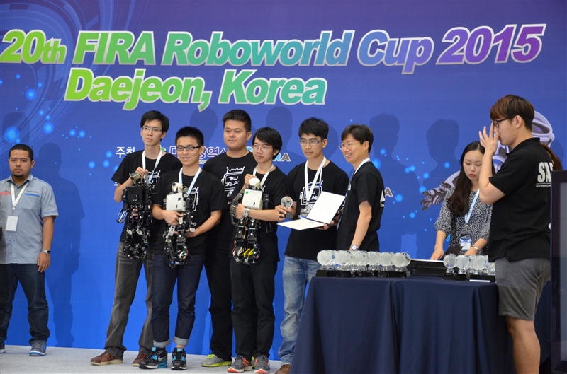 電機系教授兼智慧自動化與機器人中心主任翁慶昌、電機系助理教授鄭吉泰與李世安所領軍的淡江大學機器人研發團隊,日前參加於韓國大田(Daejeon, Korea )所舉行之「第20屆2015 FIRA (Federation of International Robot-soccer Association)世界盃機器人足球賽」,分別奪下「中型機器人組」之足球賽(Robot Soccer)的冠軍以及「人形機器人組(HuroCup)」之全能賽(All Round)的冠軍。從2003年開始至今,團隊已11度榮獲「中型機器人組」之足球賽的世界冠軍,並已連續10年蟬聯這個競賽的冠軍。此外,從2005年起至今,團隊亦已8度獲得「人形機器人組」全能賽冠軍。機器人研發團隊不僅是學校的榮耀,也是國家之光,多年來政府積極推動台灣走出去,希望世界看到台灣,團隊驕傲地做到了! 翁慶昌表示:大田為韓國的科學技術的典範城市,韓國最佳學府的韓國科學技術院(Korea Advanced Institute of Science and Technology, KAIST)亦位於大田,韓國大田曾於1993年舉辨大田世界博覽會,而1996年亦於韓國大田舉辨「第一屆FIRA世界盃機器人足球賽」,所以2015年重回韓國大田這個城市舉辦第20屆機器人競賽是相當具有歷史意義的,因此該市政府大力贊助舉辦這場競賽。能夠持續有這樣的成績,翁慶昌感謝學校長期以來的支持團隊參與這項競賽,讓學生的專業知識與技術不斷的傳承、蛻變、進化與成長,才可以克服各方的挑戰並蟬聯冠軍。 本校輪型機器人研發團隊所研製的中型足球機器人是將攝影機、工業型電腦、控制硬體電路及無線網路等設備完全整合在一台機器人身上,讓每台機器人能夠各別自主行動,並且可以透過無線網路與其他機器人以及監控端互相溝通,整個比賽過程中不得有人為遙控。今年參賽之其他隊伍的實力均大幅度的提升,無論在射門力道或移動控制的速度上都有大幅度的改良。今年團隊亦將過去所完成的第五代足球機器人進行升級改造,除了增加機器人系統穩定性及強力穩定的踢球裝置外,另外增加一些多元性進攻策略的設計,讓足球機器人具備了盤球進攻的能力,也成為今年機器人足球賽致勝的關鍵因素。除了足球賽之外,大會近幾年增加3項挑戰賽項目,團隊亦獲得避障挑戰賽(Avoidance Challenge)冠軍、公開創意挑戰賽(Open Creative Challenge)冠軍及定位挑戰賽(Localization Challenge)亞軍,所以在「中型足球機器人組」這個競賽類別上,團隊共計獲得3金1銀的優秀成績。 本校人形機器人研發團隊是以研製的第10代小型人形機器人參加高度60公分以下之「人形機器人組」的競賽,人形機器人的兩足行走相較於輪型機器人的移動是需要不同的研究方法與技術。由於整個比賽過程中不得有人為遙控,每台機器人都必須具有能夠用視覺影像的方式來自主判斷與行動的能力,因此人形機器人內部必須具有攝影機來擷取周遭的影像及辨識物體的能力,以及工業電腦與運動控制板來讓機器人能自我辨識物體及控制穩定行走的能力。今年團隊對機器人進行進一層的優化設計,讓第10代人形機器人能夠快速拆解維修,憑藉著穩定核心與機構設計,分別獲得舉重(Weight lifting)冠軍、舉重(Weight lifting)亞軍、負重爬坡(Lift and Carry)亞軍、來回競走(Spring)亞軍、跳遠(Long Jump)季軍以及籃球(Basketball)季軍。由於本次競賽有很多隊伍只針對單一項目去爭取好成績,所以此次可以獲得全能賽(All Round)冠軍更顯不易。所以在「人形機器人組」這個競賽類別上,團隊共計獲得2金3銀2銅的優秀成績。 參加此次比賽的中型足球機器人研發團隊隊長電機系碩士班同學周立翔表示:「在九連霸的壓力下又是第一年接隊長帶隊出國比賽,實在倍感壓力,但在拿到歷屆最佳成績後壓力全釋放了。我愛我的團隊,謝謝老師讓我有這一次磨練領導統御的機會。」人形機器人研發團隊隊長電機系碩士班同學蕭聖儒表示:「第一年接隊長帶隊出國比賽,在行政與技術方面要顧到,在事情的決策拿捏還有很多進步空間,雖然過程中很累,但成果是豐碩的,隊員們藉由這次比賽規劃安排中學習到更多新的知識,讓大家盡可能成為整合的人才,記住走過的路是不會背叛你的。」人形機器人研發團隊隊員電機系碩士班同學黃彥捷則表示,他主要負責人形機器人的電路設計與維護以及內部參數的校正,比賽讓他學習到許多有關人形機器人的新知識,雖這次比賽場地有幾個出乎意料之外,不過團隊還是勇於挑戰,臨時調整人形機器人內部參數與策略,皇天不負苦心人,最後團隊拿到全能賽冠軍,大家不眠不休的努力,終於被世界看到!
